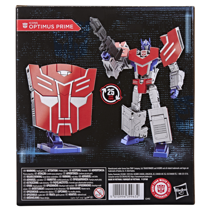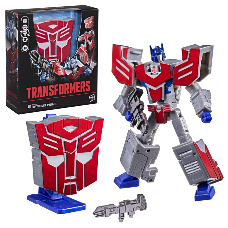 Display your faction allegiance with the Icons Optimus Prime collectible figure! The 6.75-inch (17 cm) figure converts between robot action figure and Autobot faction symbol in 25 steps. It includes a display stand for logo mode as well as a blaster accessory for epic posing in robot mode. With intricate poseability and deco and details inspired by the Transformers universe, this unique Optimus Prime Transformers figure makes an awesome addition to any collection. Look for more Transformers collectible toys (sold separately, subject to availability) featuring favorite characters like Bumblebee, Megatron, and more to create a lineup that is — More Than Meets the Eye.